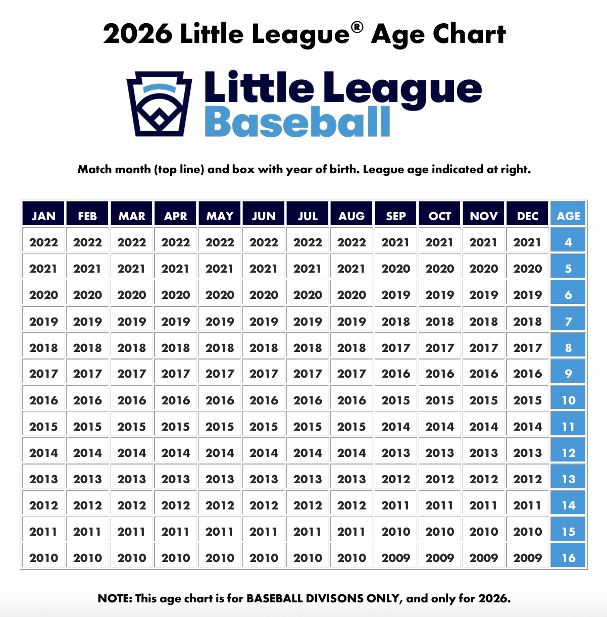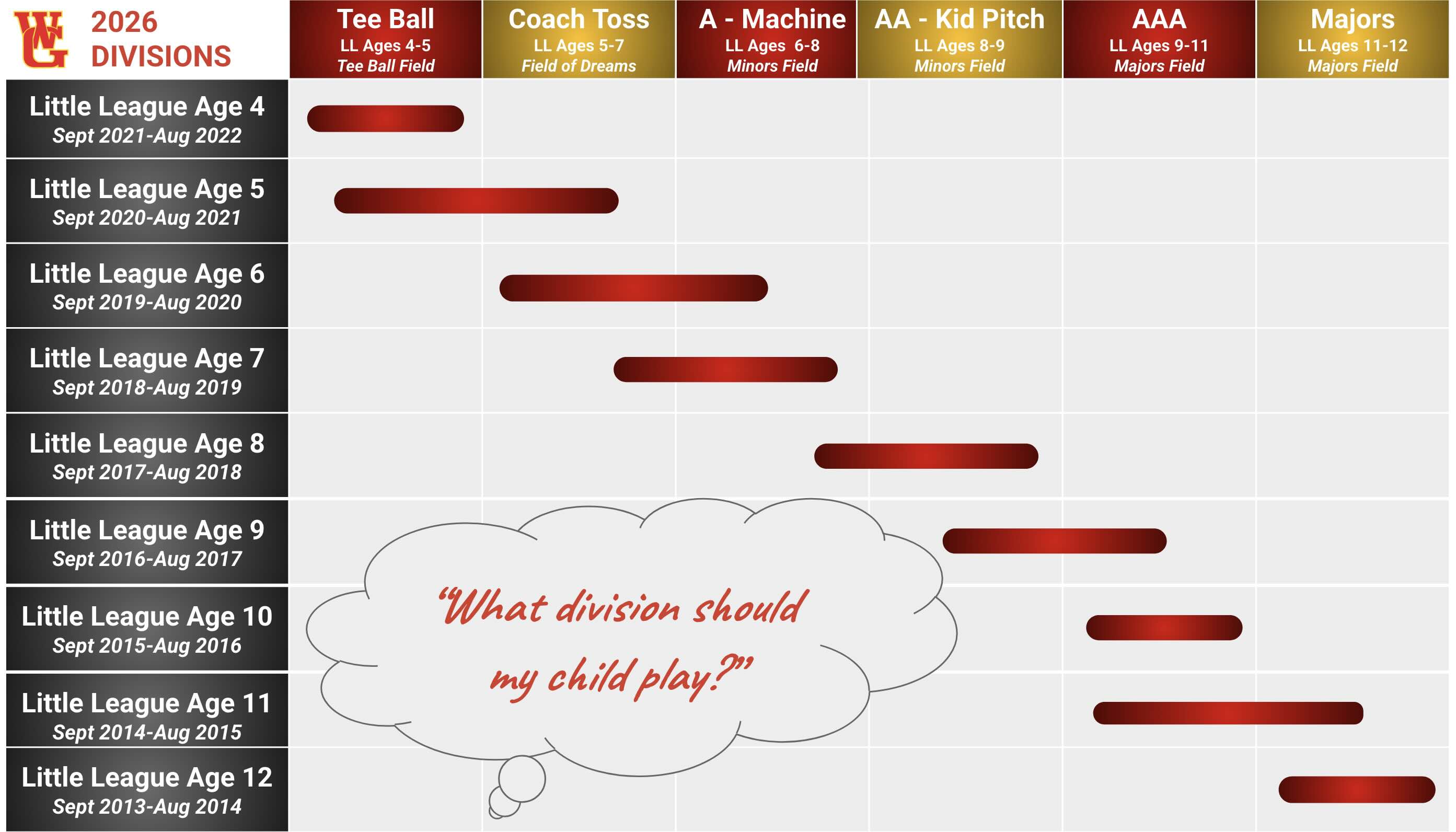 WGLL follows Little League International's rules for ages. Your child's Little League will be calculated for you when you register. You can also learn your child's LL Age by viewing this chart: