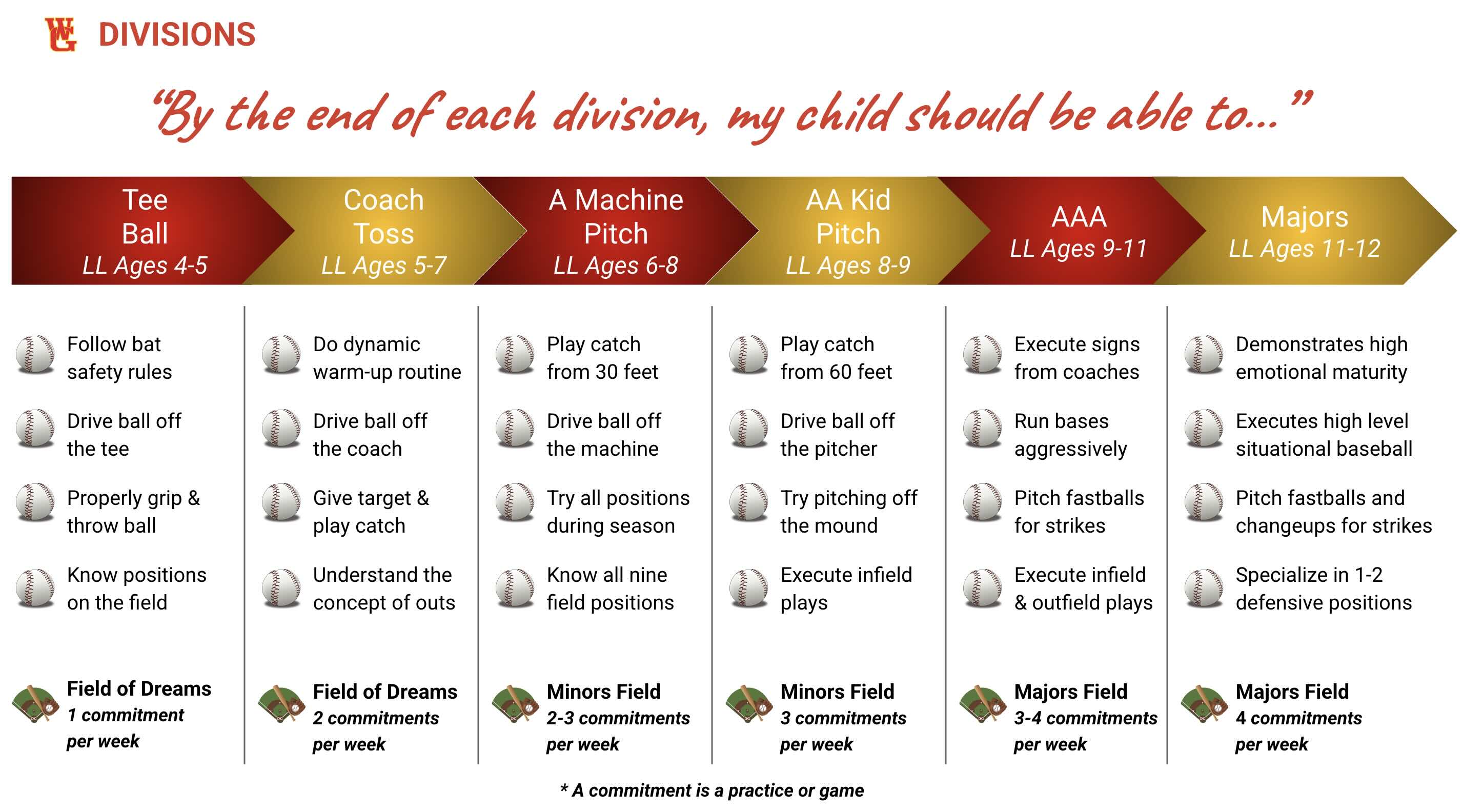 * There are rare exceptions for players who should play down for safety reasons or play up as an elite player in that division. The Player Agent uses Evaluation Day and manager input to help determine such cases.